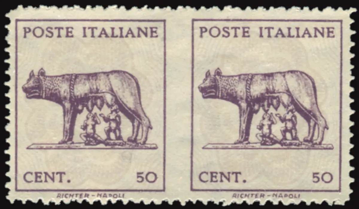 Wölfe mit filigranem waagerechtem Paar Sorte Ohne Gummi M - Kapitolinischer Wolf mit filigraner Nr. 515s horizontales Paar ungezähnt in der Mitte - Selten - Kat. euro 1.300 Cod. 238/16
