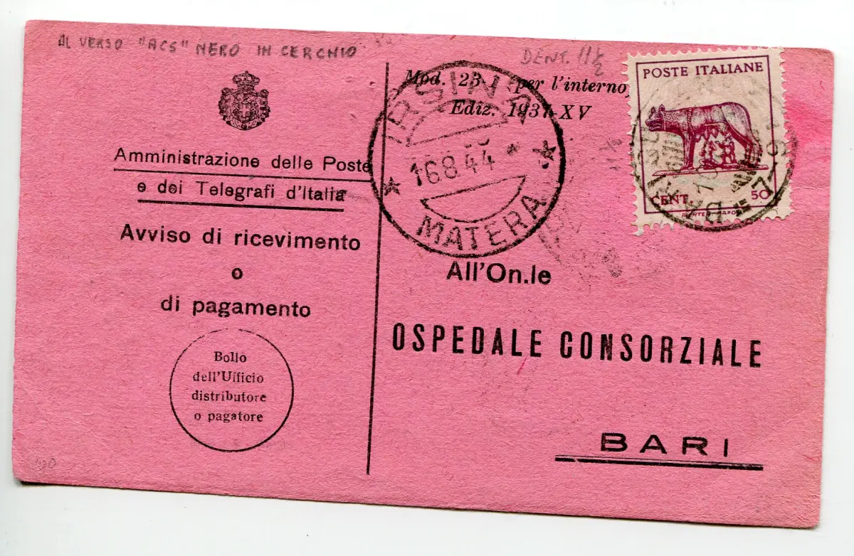 Lupe n. 515A isoliert auf Empfangsbestätigung - Lupe Nr. 515A isoliert auf Empfangsbestätigung (Mod. 23) von Bari nach Irsina am 16.8.44 - Ungewöhnlicher Code 357/11