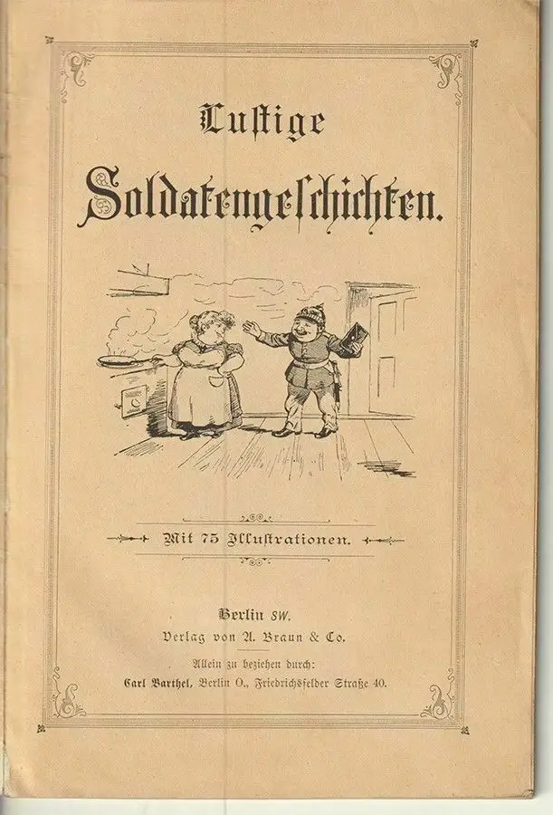 Bemerkungen: Durchgehend illustriertes Heft mit Soldatenanekdoten. Hinterer Deckel d. Brosch mit Vermerk:"Allein zu beziehen durch Carl Barthel, Berlin [...]".