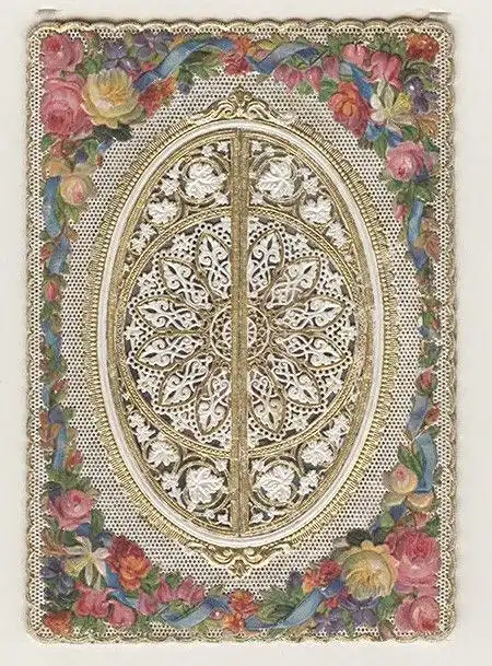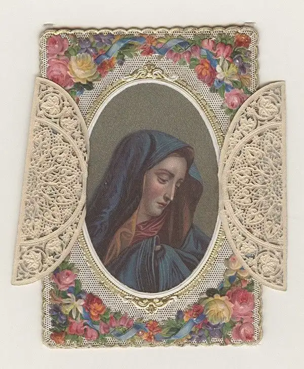 Bemerkungen: Ursprünglich aufstellbare grestanzte Andachtskarte mit floralen Papierapplikationen. Auf der hinteren Kartenseite ist das Marienportrait montiert, der vordere Kartenteil ist durch zwei Türchen aufklappbar. Verso mit gedrucktem Mariengebet und handschriftlicher Notiz: "Zur freundlichen Erinnerung vom heiligen Berge. 1873, 27/8. Lori." Der "Heilige Berg" mit der barocken Basilika Mariä Heimsuchung ist heute ein Stadtteil von Olomouc/Olmütz.