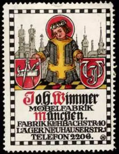 Möbel, Münchner Kindl, Monogramm, Fabrik Kühbachstraße 10, Lager: Neuhauserstr. 1, Größe/Zustand: 6x4 , guter Zustand, Original alte Reklamemarke die seinerzeit für die Werbung benutzt wurde