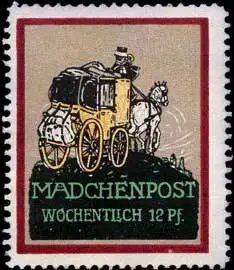 wöchentliche Zeitschrift, Postkutsche, Größe/Zustand: 4x4 , guter Zustand, Original alte Reklamemarke die seinerzeit für die Werbung benutzt wurde