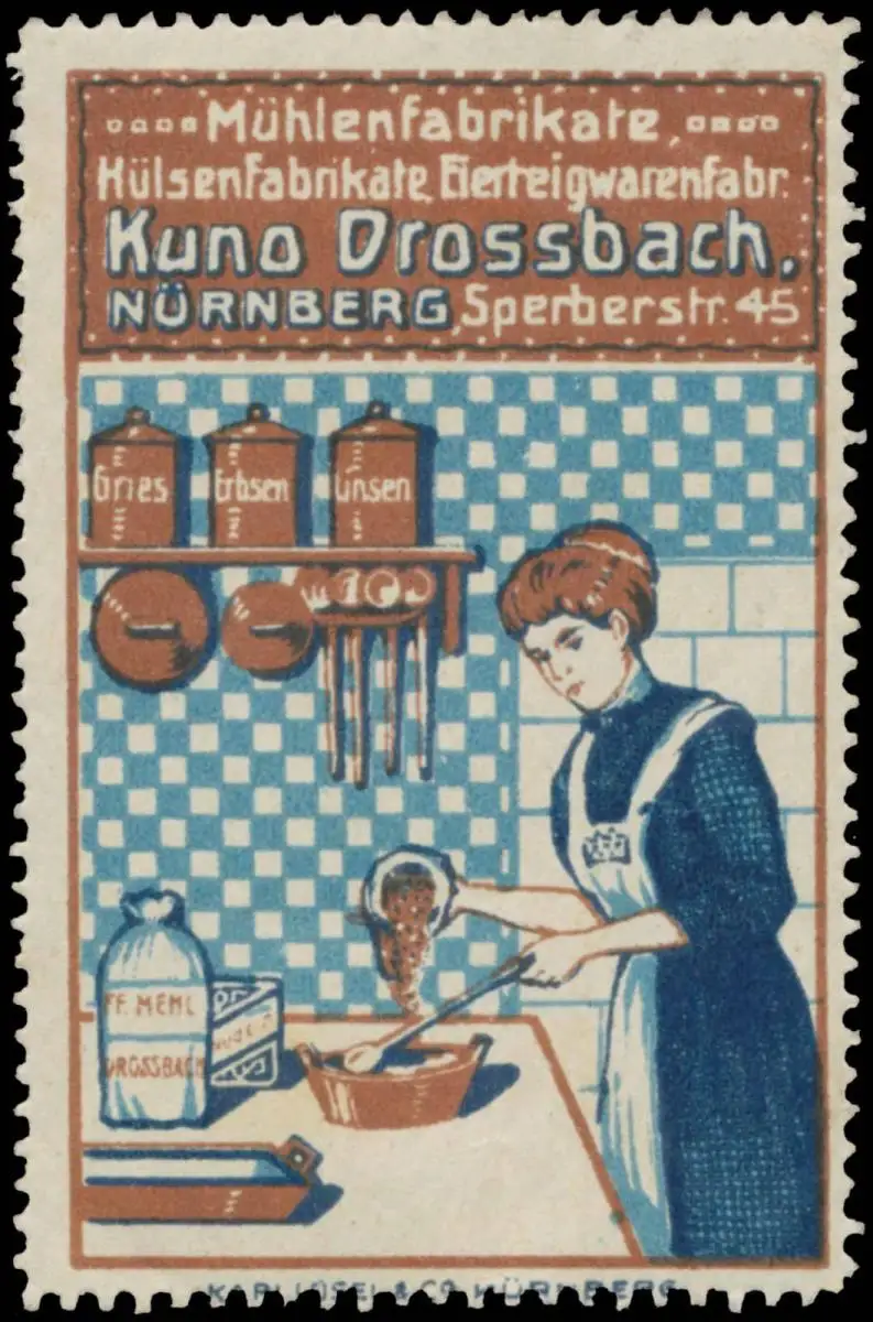 Hülsenfabrikate, Eierteigwarenfabrik, Sperberstrasse 45, Frau in der Küche, Druck: Karl Lösel & Co. Nürnberg, Größe/Zustand: 6x4 , guter Zustand, Original alte Reklamemarke die seinerzeit für die Werbung benutzt wurde