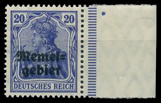 20 Pfg Wert aus der Freimarkenausgabe Germania mit Aufdruck "Memelgebiet", Plattendruck, Seitenrandstück, Linie gefaltet