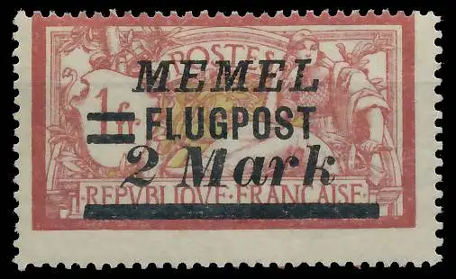 2 M auf 1 Fr Wert aus der Freimarkenausgabe von Frankreich "Memel", Aufdruck kursiv, Flugpostausgabe, Abstand zwischen 2 und Mark 2,3mm statt normal 3,1mm