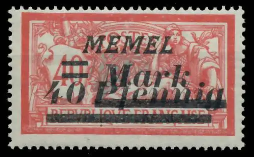Mark auf 40 Pf auf 40 C Wert aus der Freimarkenausgabe von Frankreich "Memel", Aufdruck kursiv