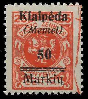 50 M auf 25 C Wert aus der Freimarkenausgabe von Litauen (nicht ausgegebene Dienstmarken) mit Aufdruck "Kleipeda", Schrift gerade und kursiv, kleine Haftspur, etwas Farbabklatsch