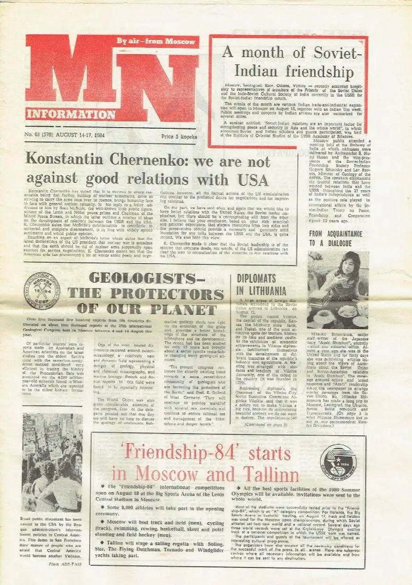 guter bis sehr guter Zustand, geringe Gebrauchs- und Alterungsspuren: mittig quer etwas schräg gefalten - Ränder gelegentlich mit kleinen Blessuren, originale Wochen-Zeitung der Sowjetunion sowjetisches Zeitgeschehen in englischer Sprache "MN Information" comes out on Tuesdays and Saturdays and offers in brief the latest Information on events in the USSR and in the world reported by TASS and foreign news agencies. Nothing short of the material carried in the editions of both "Moscow News" and "MN Information" gives you a full idea of life in the Soviet Union for the week." u. a. ein kurzer Bericht "The Olympic show in Los Angeles ends", Papier, ca. 29,5 x 42, 8 Seiten mit zahlreichen Bildern