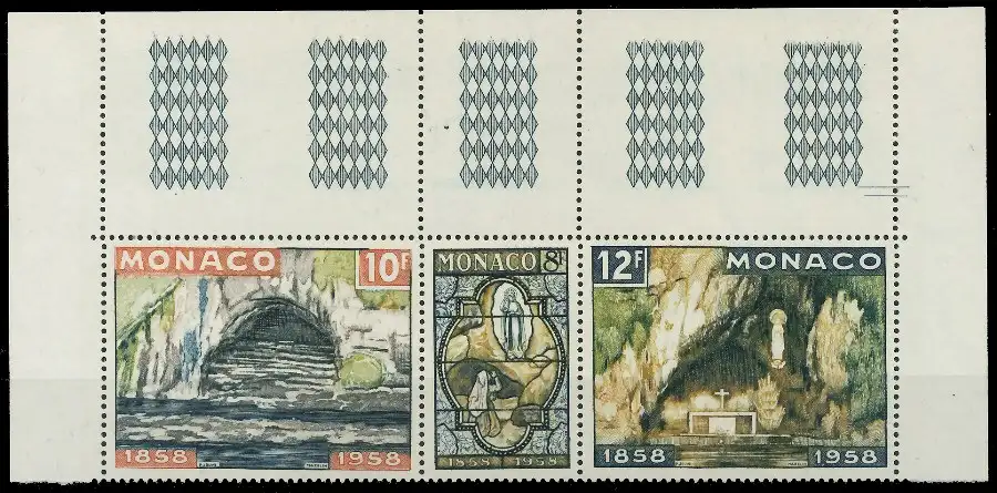 8 Fr. + 10 Fr. + 12 Fr. Wert aus der Ausgabe 100. Jahrestag der Marienerscheinung in Lourdes zusammenhängend im 3er Streifen