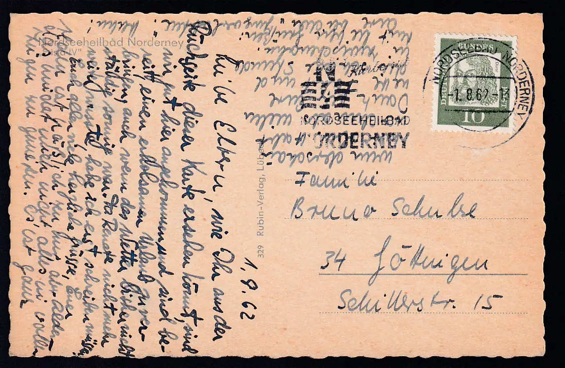 zwei sehr schöne Bahnpostbelege, einmal HUSUM-GARDING von 1916 - ohne Zugnummer aufgrund der Furcht vor feindlicher Spionage - und ERFURT-EISENACH von 1965. Vielen Dank, bin mit der Lieferung sehr zufrieden.
