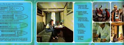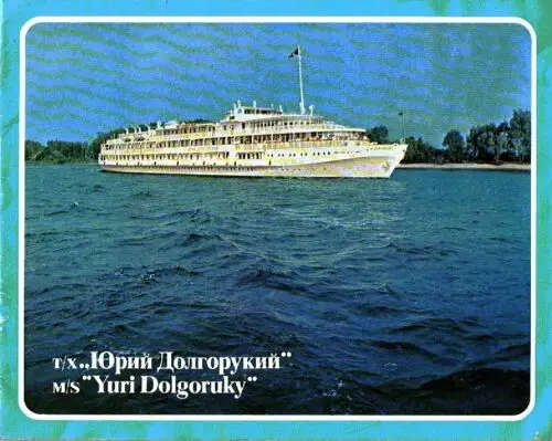 guter bis sehr guter Zustand, geringe Gebrauchs- und Alterungsspuren: die beiden Außenfalze teils gering abgenutzt - teils leicht knittrig, 1960 in der Mathias-Thesen-Werft in Wismar als 38. Schiff der Rodina-Klasse für Sowjetunion gebaut, fuhr es fast 30 Jahre auf der Wolga, bevor es Mitte der 90er Jahre verschrottet wurde und als Ersatzteilspender für andere Schiffe der Klasse diente hier erhalten Sie einen Prospekt, welcher in Deutsch + Englisch + Französisch + Russisch das Schiff bewirbt, Papier, ca. 19,5 x 16, 12 Seiten mit zahlreichen Bildern