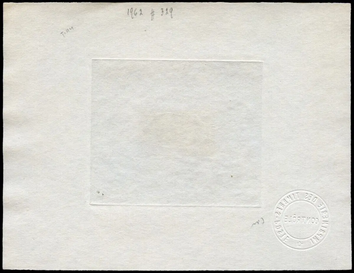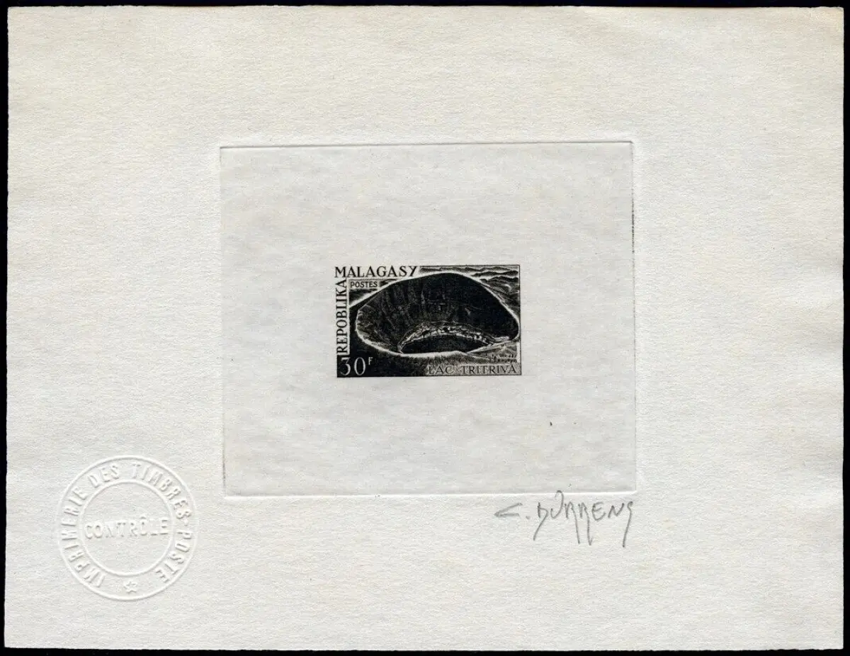Freimarke 30 Franc Vulkankratersee als Probedruck in Blockform mit abweichender Farbe und vom Entwerfer handsigniert.
