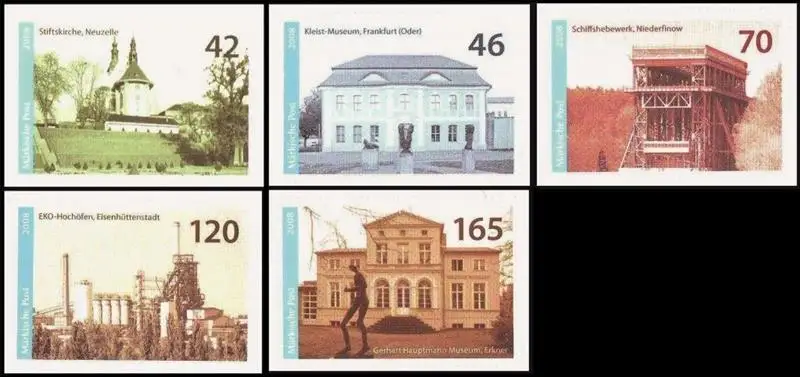 • MichSeite Märkische Post: MiNr. 6 - 10, 01.12.2008, "Sehenswürdigkeiten", Satz, postfrisch Beschreibung \nAusgabeland: Bundesrepublik Deutschland \nPostdienstleister: Märkische Post (PZO Oderland), Frankfurt (Oder) \nAusgabeanlass: Briefmarkenausgabe "Sehenswürdigkeiten" Katalognummer: MiNr. 6 - 10 Ausgabedatum: 01.12.2008 Nominale: Satz (5 Wert) zu 0,42 EUR, 0,45 EUR, 0,70 EUR, 1,20 EUR, 1,65 EUR \nTyp: - \nErhaltung: selbstklebend, zähnungsartig gestanzt, postfrisch \nHinweis: -