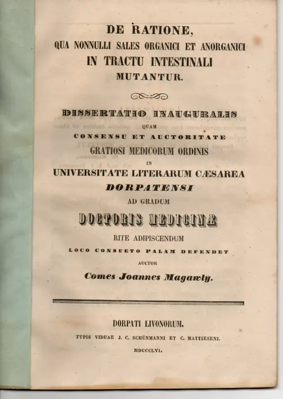 Magawly, Comes Joannes: De ratione, qua nonnulli sales organici et anorganici in tractu intestinali mutantur. Dissertation.
