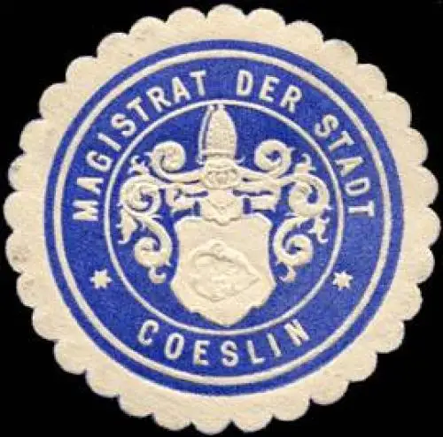 Coeslin, blau, weiß, geprägt, Größe/Zustand: 3 , guter Zustand, Original Verschluss-Siegelmarke aus Papier welche früher von Behörden, Firmen etc. zum Versiegeln der Briefe benutzt wurden