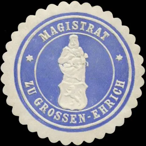Grossen-Ehrich, blau, weiß, geprägt, Größe/Zustand: 4 , guter Zustand, Original Verschluss-Siegelmarke aus Papier welche früher von Behörden, Firmen etc. zum Versiegeln der Briefe benutzt wurden
