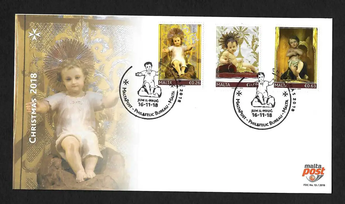 Malta 2018: Weihnachten, 3 Briefmarken, FDC