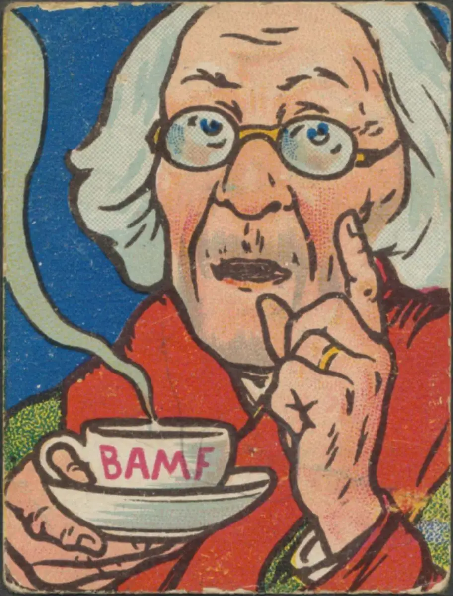 Grosspapa Weisheit. Bamf-Kaffee sag ich von je, ist und bleibt doch Bamf-Kaffee! Stets hübsch heiss und nie zu kalt, macht er hundert Jahre alt. Edwin Borrmann-Serie Nr. 2, Größe/Zustand: 6x4 , guter Zustand, Original alte Reklamemarke die seinerzeit für die Werbung benutzt wurde