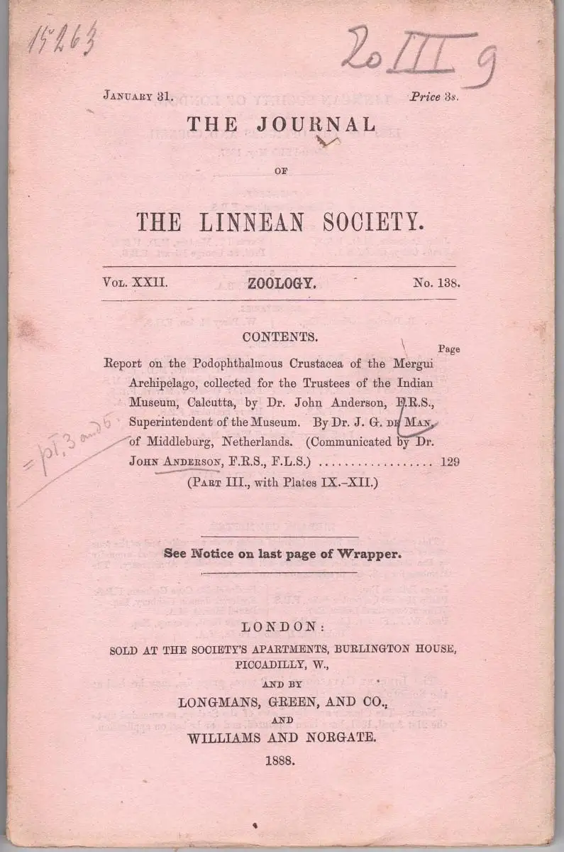 Titel: Report on the podophthalmous crustacea of the Mergui Archipelago, collected for the Trustees of the Indian Museum, Calcutta, by Dr. John Anderson, part 3. The Journal of the Linnean Society of London, Zoology, Volume 22,138