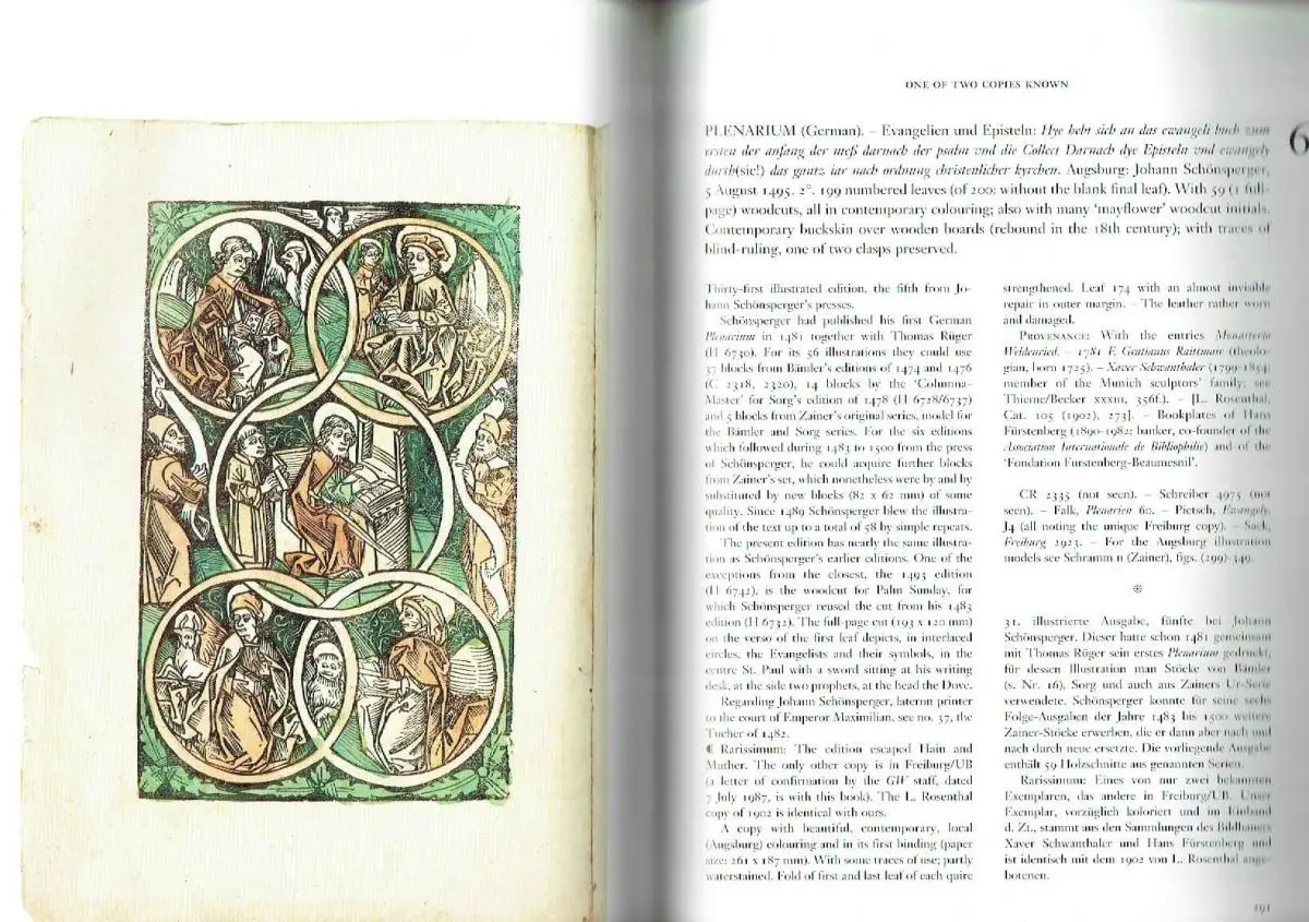 sehr guter Zustand, geringe Gebrauchs- und Alterungsspuren: Einbandunterkanten mit 3 kleinen Druckstellen - Seiten sauber und ordentlich - Schutzumschlag gering defekt, Eine Apologie gegenüber unseren deutschsprachigen Lesern zuvor: Der zunehmend internationalen Ausrichtung des Kunsthandels und der Majorität unserer Kunden rechnungtragend, erscheint dieser Katalog — wie schon unser Katalog 6 — in englischer Sprache. Jedem englischen Kommentar ist jedoch ein deutscher angehängt, zwar mehr oder minder gekürzt, bisweilen aber auch mit zusätzlichen Informationen. Der Kenner wird dem Inhaltsverzeichnis entnommen haben, daß der Katalog eine Reihe spektakuläre, auch einige (zumindest im Handel) singuläre Drucke anbietet. Tatsächlich lassen sich von 19 Ausgaben nur elf bis maximal zwanzig Exemplare nachweisen; von weiteren acht nur sechs bis zehn Exemplare; und von immerhin fünf Katalognummern sind lediglich drei bis fünf Exemplare bekannt. Von den Nrn. 67 (Plenarium) und 77/H (Justinians Institutiones) scheint es gar nur einen Zwilling zu geben. Das gleiche gilt für den Teütsch Kalender für 1492 (Nr. 64); und der für das Jahr 1514 (Nr. 91) ist sehr wahrscheinlich ein Unicum. Einige Drucke kommen aus Offizinen mit bekanntermaßen geringem Ausstoß. Das gilt für den Vocabularius des Nicolaus Bechtermünze in Eltville (Nr. 8), das von den Brüdern vom Gemeinsamen Leben in Marienthal gedruckte Mainzer Brevier (Nr. 14), die beiden Bidpai-Drucke Conrad Fyners in Urach (31 und 33), die Nrn. 54 und 56, die bereits ein Drittel der Buchproduktion des Peter Berger in Augsburg repräsentieren, der Nitzschewitz (65, das einzige in Zinna gedruckte Buch), die zwei Drucke des Petrus de Butzbach in Mantua (21/II-III) oder die drei von nur elf Drucken aus der Privatpresse des Herzog Heinrich in Simmern (102, 105, 106). Zwei Einzelblätter stammen aus dem ersten bedeutenden Typographicum der westlichen Welt (Nr. 4). Unter den Druckorten stellt Augsburg mit 35 Katalognummern fast jede dritte. Im übrigen sei bereits hier auf das Verzeichnis der Druckorte und Drucker (SS. triff.) verwiesen. "Die Bücher sind nach der chronologischen Folge ihres Erscheinens geordnet, Xylographica separat vorangestellt. Mehrere Indices (SS. 441 ff.) erschließen das Angebot nach Titeln in deren alphabetischer Folge, nach Druckorten und Druckern, nach weiteren Personen (wie Mitautoren, Übersetzer, Herausgeber, Künstler, Verleger), nach Buchbindern und nach Provenienzen. Bei jeder Katalog-Nr. gibt der erste, englische Textblock die Basisinformationen zur Edition, dazu Angaben zu Kollation, Illustration und Einband. Der zweispaltig gesetzte Kommentar ist in seinem deutschen Teil meistens nicht bloße Übersetzung des englischen, gegenüber diesem fast immer gekürzt, vor allem was die Beschreibung von Einband, Zustand und Provenienz angeht. Generell sind Recto- bzw. Versoseiten eines Blattes mit >a< bzw. >b< bezeichnet, wie im Gesamtkatalog der Wiegendrucke (= GW; s. das Literaturverzeichnis auf SS. 450 ff.). Auch die Kurzbezeichnung für Bibliotheken (etwa Paris/BN) folgt meist dem GW, während bei den Literaturangaben oft eine Fassung angestrebt wird, die das behandelte Thema andeutet. Buchillustration wird detailliert behandelt, Buchdruckern (zumindest im englischen Kommentar) eine kurze Notiz gewidmet. Q markiert den Beginn der Beschreibung individueller Merkmale des besprochenen Exemplares (Kolorit, Rubrizierung, Defekte u. dgl.). Häufig eröffnen diesen Abschnitt Angaben -zur Seltenheit oder zu Druckvarianten, während die Angaben zu Einband und Provenienz hinten angestellt sind. Buchtitel sowie handschriftliche Einträge sind kursiv wiedergegeben (aufgelöste Abbreviaturen nicht kursiv oder zwischen runden Klammern). Rechteckige Klammern deuten etwas als [ermittelt] an. »Originalzitat« steht in doppelten Anführungszeichen, während einfache ein >übersetztes Zitat< oder >Sogenanntes< kennzeichnen (z. B. >auf Riemchen