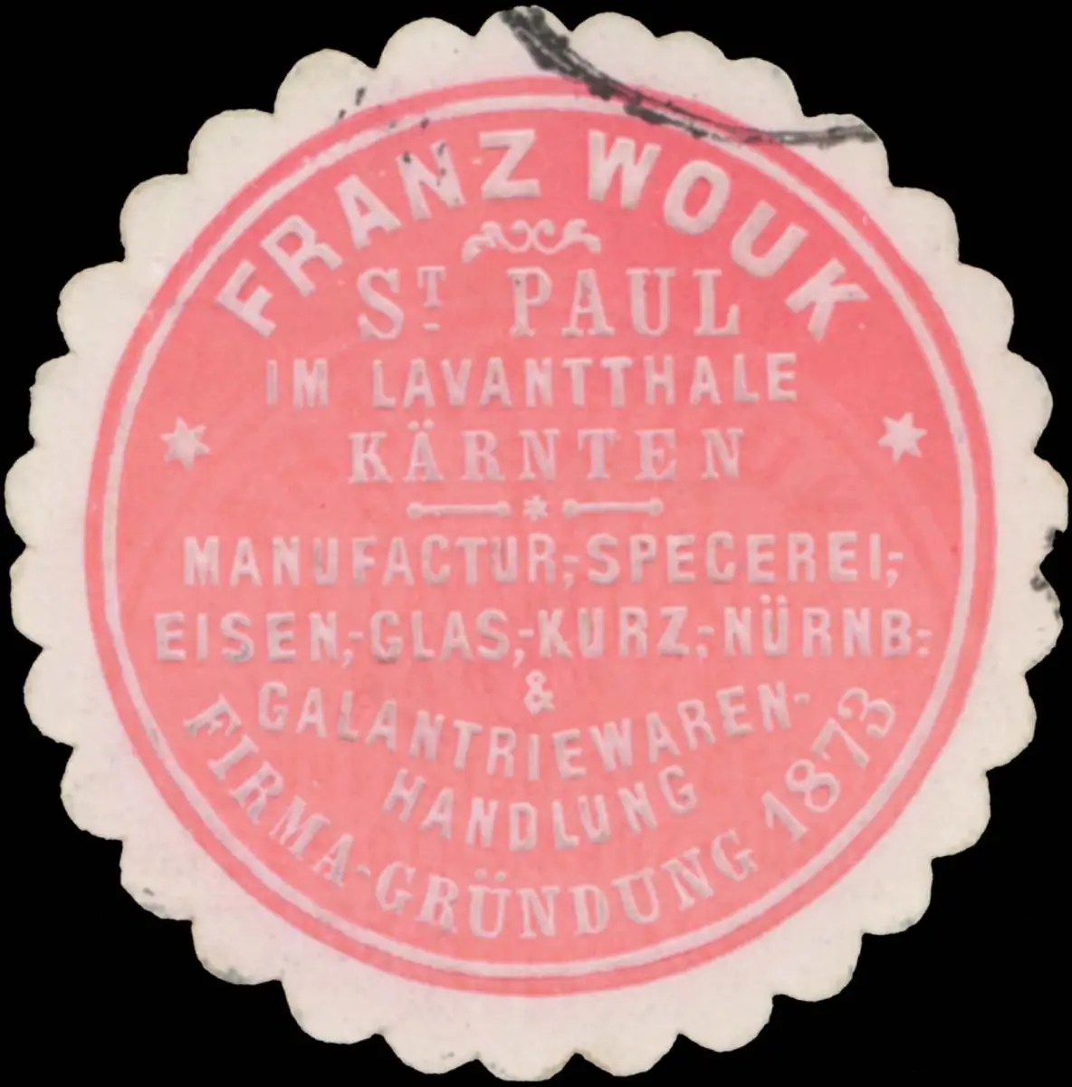 Eisen-, Glas-,Kurz- und Galateriewarenhandlung, St. Paul im Lavanttal, Kärnten, 1873 gegründet, Größe/Zustand: 4 , Stempelabdruck, guter Zustand, Original alte Reklamemarke die seinerzeit für die Werbung benutzt wurde