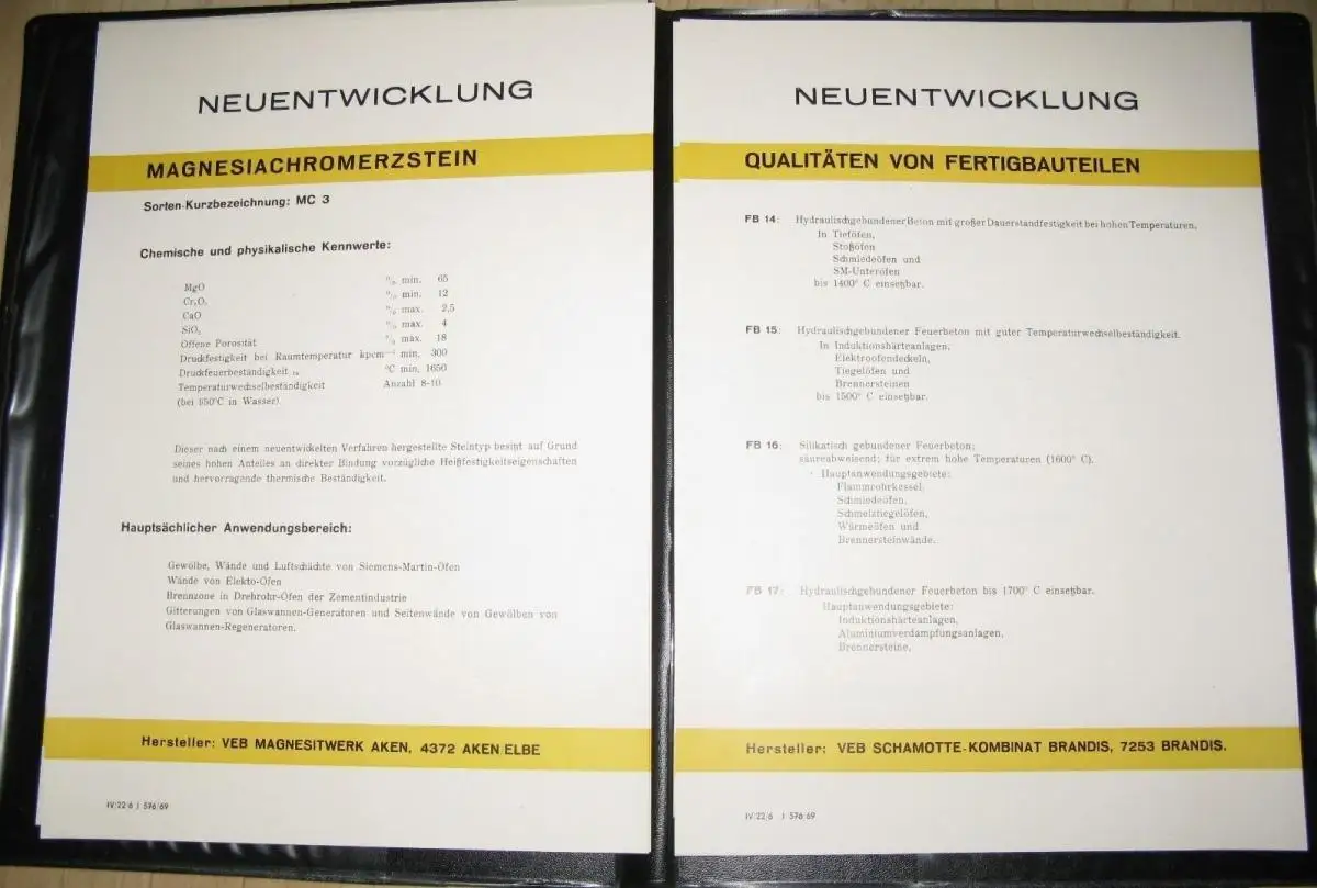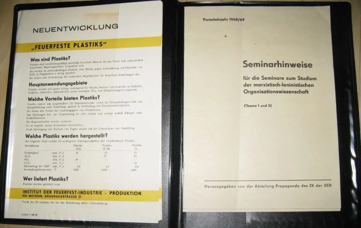 guter bis sehr guter Zustand, geringe Gebrauchs- und Alterungsspuren: Broschüre diagonal geknickt, Mappeninhalt: - 2 Broschüren mit 28 Seiten: Parteilehrjahr 1968/69 - Seminarhinweise für das Studium der marxistisch-leninistischen Organisationswissenschaft - 7 Prospekte Neuentwicklung (je ein Blatt, einseitig bedruckt) - VEB Feuerfestwerke Wetro, Wetro bei Bautzen: Mammut-SiC-Schmelztiegel - VEB Silika- und Schamottewerke Rietschen: Kaolinsteine CX 66 (beidseitig bedruckt) - VEB Tonwerke Dommitzsch: Kaolinschaumleichtsteine KSL 7 - Institut der Feuerfest-Industrie-Produktion Meissen: Feuerfeste Spritzgemenge - Institut der Feuerfest-Industrie-Produktion Meissen: Feuerfeste Plastiks - VEB Magnesitwerk Aken: Magnesiachromerzstein - VEB Schamotte-Kombinat Brandis: Qualitäten von Fertigbauteilen, Kunststoff, ca. 25 x 31,5, original Mappe mit 2 Broschüren und 7 Prospekten