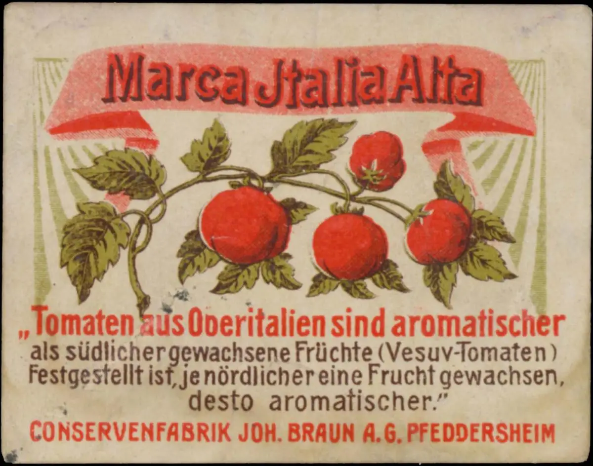 Tomaten aus Oberitalien sind aromatischer, Größe/Zustand: 4x5 , fleckig, Original alte Reklamemarke die seinerzeit für die Werbung benutzt wurde