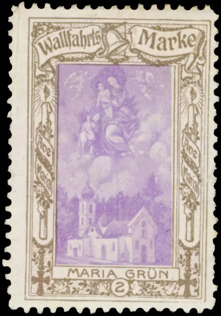 Wallfahrts-Marke, Spendenmarke, Österreich, violett, gelb, Größe/Zustand: 5x3 , guter Zustand, Original alte Reklamemarke die seinerzeit für die Werbung benutzt wurde