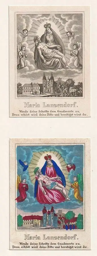 Bemerkungen: Auf Wolken und flankiert von Engeln ist die barocke Pietà-Gnadenstatue aus der Gnadenkapelle der Wallfahrtskirche in Maria Lanzendorf zu sehen. Darunter ist eine kleine Ansicht der Wallfahrtskirche dargestellt. - Dabei: Altkolorierte Doublette. Leicht stockfleckig.