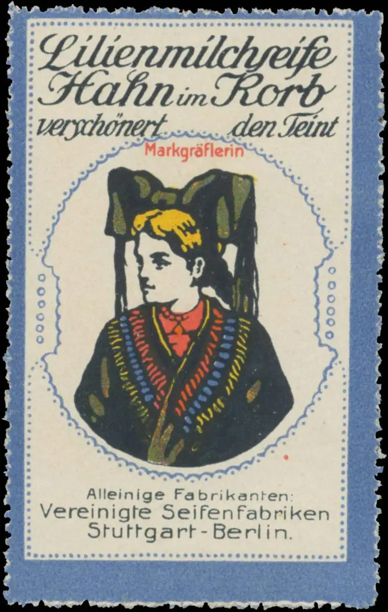 Lilienmilchseife Hahn im Korb verschönert den Teint. Tracht, Größe/Zustand: 7x5 , guter Zustand, Original alte Reklamemarke die seinerzeit für die Werbung benutzt wurde