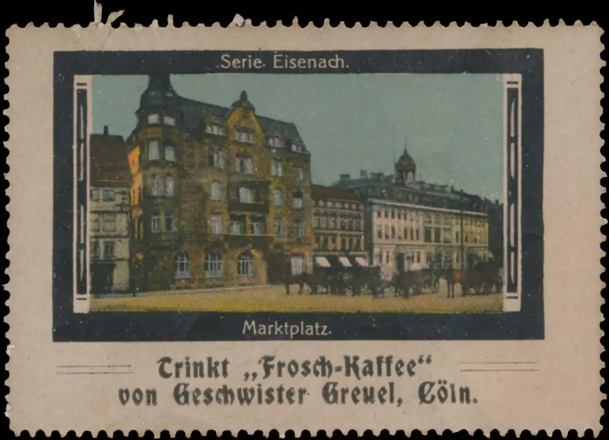 Serie Eisenach, trinkt Frosch-Kaffee von Geschwister Greul, Cöln, Größe/Zustand: 5x7 , beschädigt, Original alte Reklamemarke die seinerzeit für die Werbung benutzt wurde