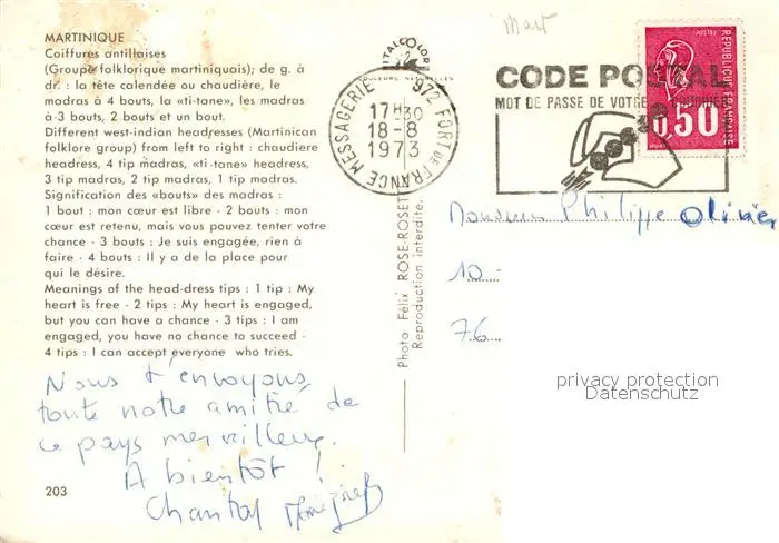 Martinique Coiffures antillaises Martinique postalisch gelaufen 1973 Erhaltung siehe scans [FriedD77] Frierer
