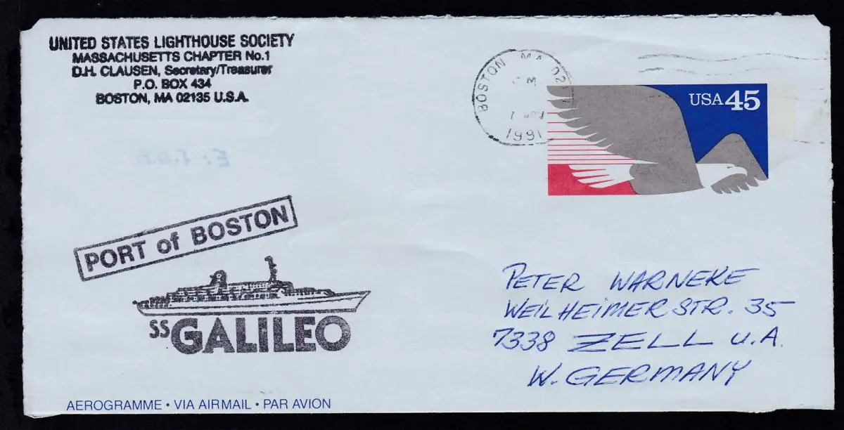 Maschinenstempel Boston 27 NOV 1991 + R1 PORT OF BOSTON + Cachet SS Galileo
