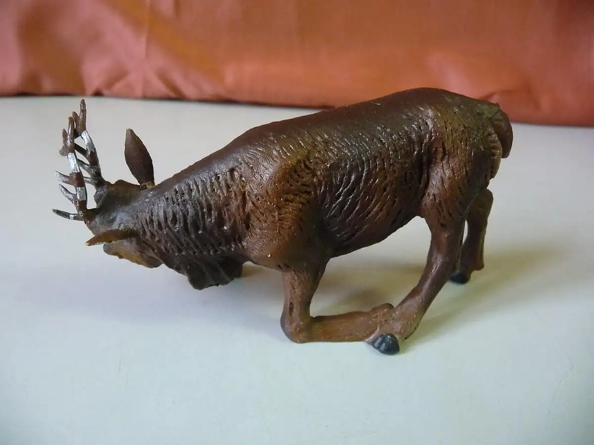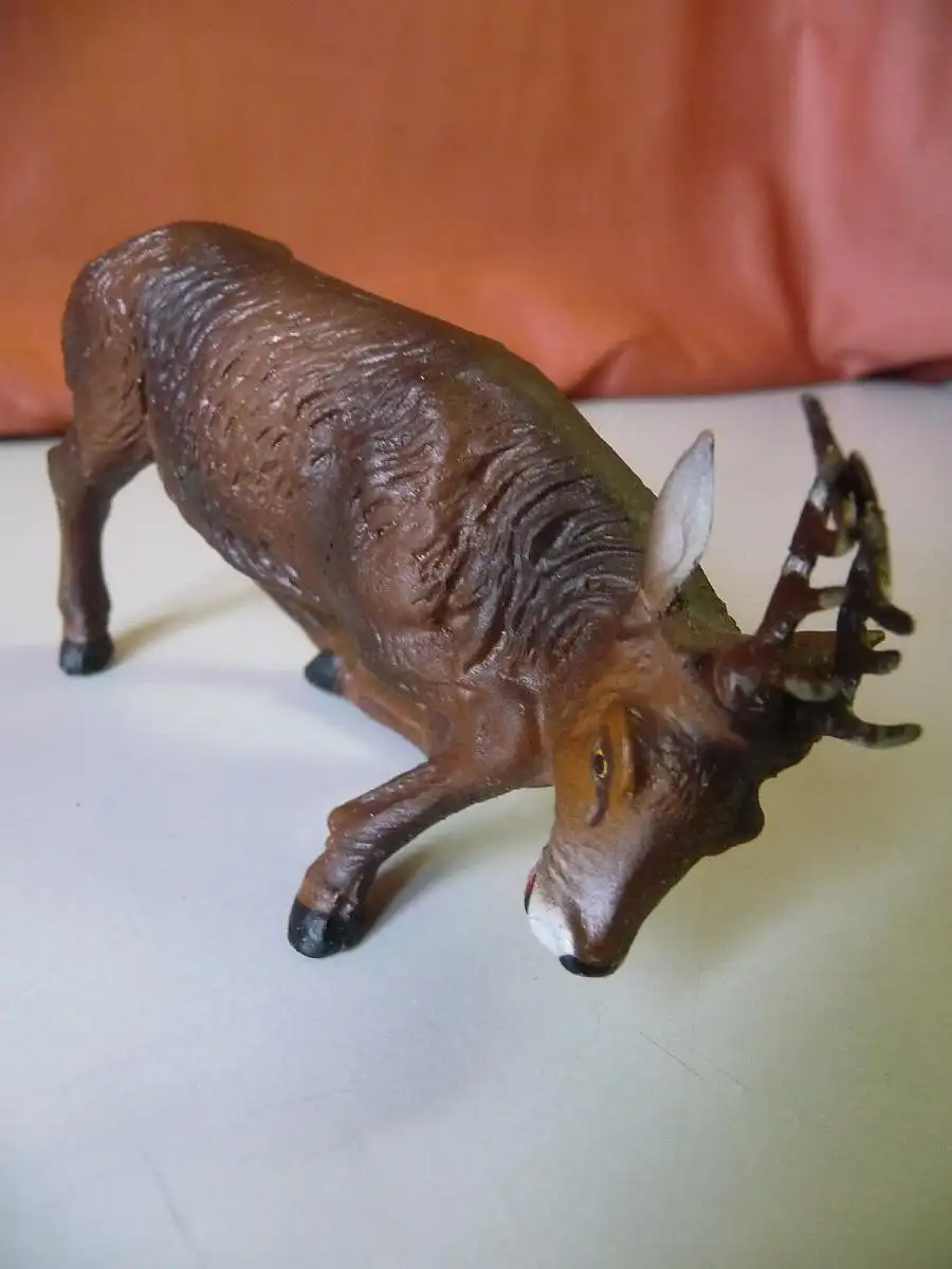Schöne alte Massefigur Hirsch kämpfend (leider nur eine Figur erhalten!), Geweih aus Zinn Ohne Herstellerhinweis, Länge ca. 10 cm, Höhe ca. 5,6 cm Zinngeweih etwas verbogen, sonst altersgemäß gut erhalten. Zustand vgl. Fotos!