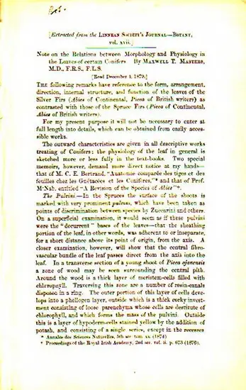 Masters, Maxwell T: Note on the Relations between Morphology and Physiology in the Leaves of certain Conifers. Read December 4, 1879. Extracted from the Linnean Society´s Journal-Botany, Vol. XVII.