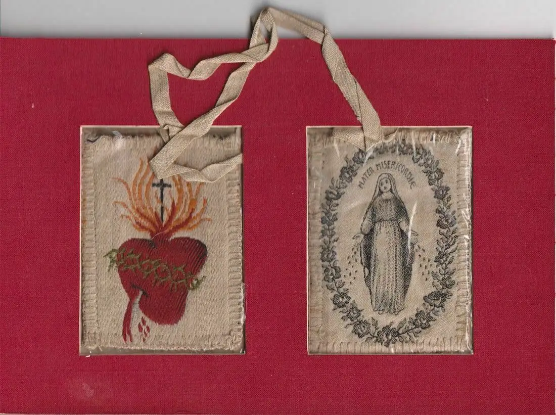 o. O. [Mitte 19. Jahrhundert]. Zweiteiliges Amulett; Schwarz bzw. bunt gewebte Darstellung auf ungefärbtem Stoff mit umstochenem Rand und Umhängeband. Je 9,8 x 7 cm. (Stoffgr.). Minimal fleckig, gut erhalten.
