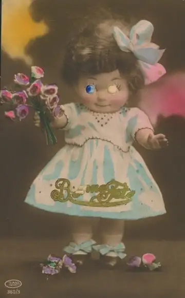 Material Ak Glückwunsch, Mädchen mit Plastikaugen, Puppe, Blumenstrauß