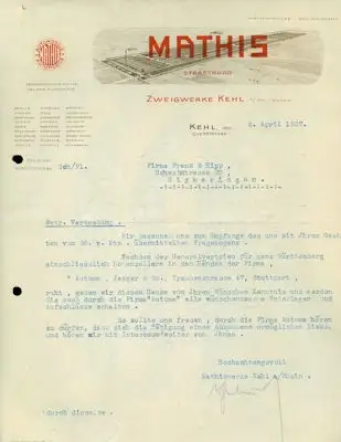 Mathis Zweigwerk Kehl Brief 1927