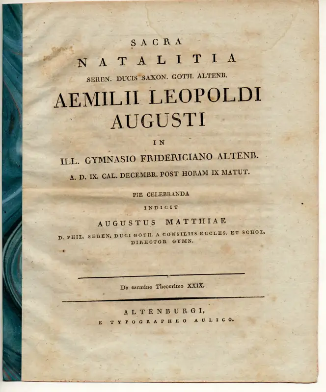 7 S., 20 cm, papierbedingt gebräunt, leicht stockfleckig. Matthiae (1769-1835) war Direktor des Gymnasiums in Altenburg und herzogl. Gothaischer Kirchen- u. Schulrat.