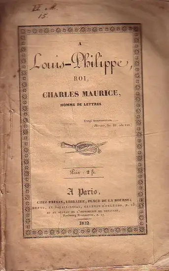 Broche avec brochage au fil de lin. Broché avec couv. orig., celle-la fortmement tachetée. - Maurice était propriétaire du 'Courrier des Théatres'; ici une contribution au règne de Louis-Philippe. En bon état. --- 24 x 16 cm, Broschur mit 63 S. Und einer Fadenheftung, Originalumschlag teilw. Stark fleckig, innen etwas stockfleckig