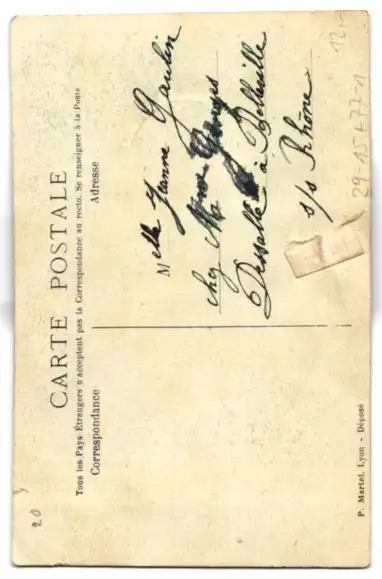 Personenbezogene Daten auf der Rückseite der Karte wurden durch blauen Textmarker unkenntlich gemacht. Die blauen Stellen sind auf die Vorderseite durchgeweicht und wirken sich negativ auf das Postkartenfoto aus