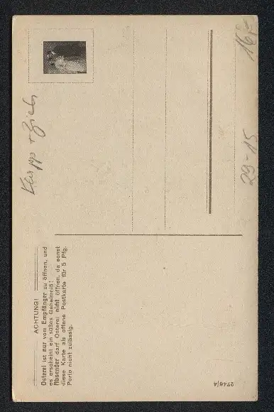 Personenbezogene Daten auf der Rückseite der Karte wurden durch blauen Textmarker unkenntlich gemacht. Die blauen Stellen sind auf die Vorderseite durchgeweicht und wirken sich negativ auf das Postkartenfoto aus