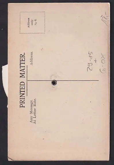 Personenbezogene Daten auf der Rückseite der Karte wurden durch blauen Textmarker unkenntlich gemacht. Die blauen Stellen sind auf die Vorderseite durchgeweicht und wirken sich negativ auf das Postkartenfoto aus