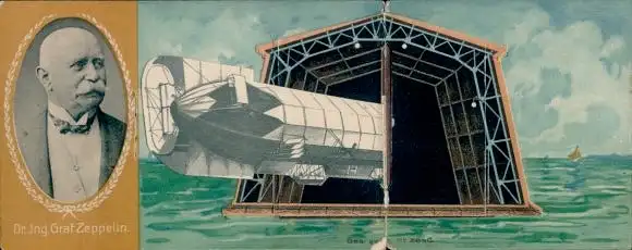 Mechanische Ak Ferdinand Graf von Zeppelin, Portrait, Zeppelin, Luftschiffhalle