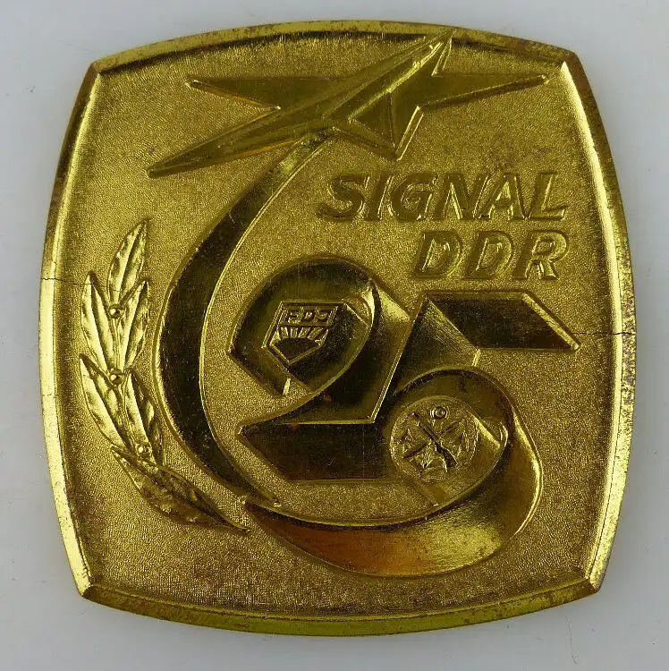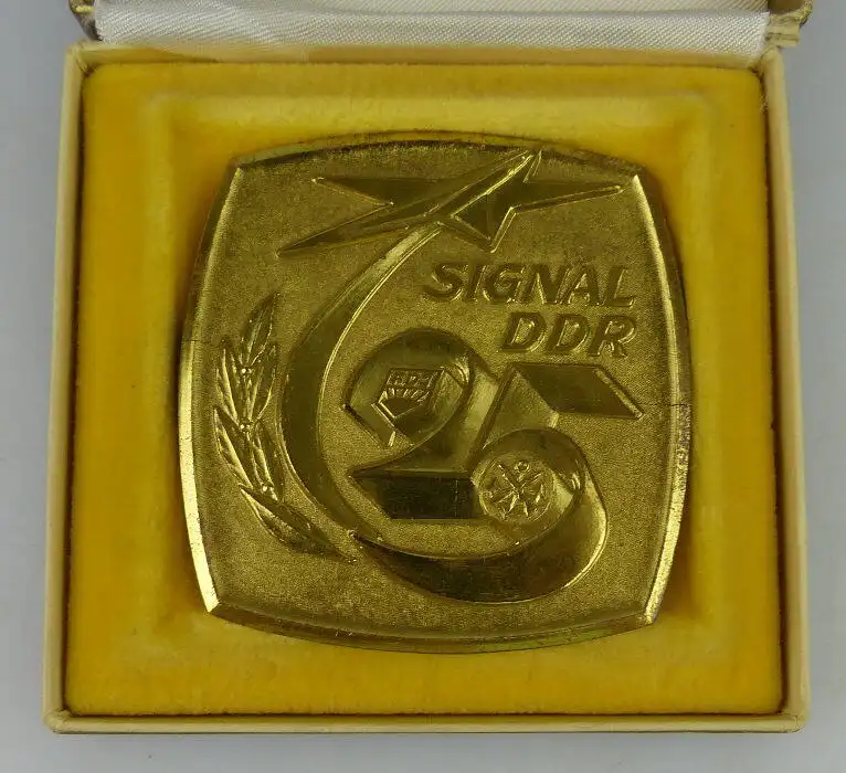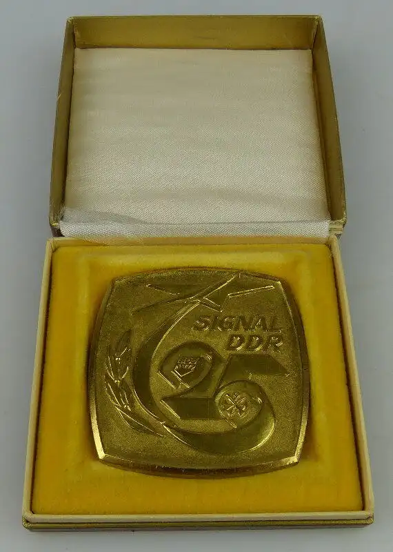 Herzlich Willkommen Gern können Sie auch in meine anderen Auktionen reinschauen. Viel Spaß dabei Sie sehen hier auf eine original alte Medaille im Etui: 25 Signal DDR Farbe: goldfarben \nGröße ca.: 6,4 x 6,4 cm Die Medaille ist im gebrauchten Zustand, mit Gebrauchsspuren. Die Medaille ist nicht gereinigt, geputzt oder geschönt worden. Das Etui ist an den Kanten gebrauchsbedingt bestoßen. Bitte sehen Sie sich die Fotos zum Zustand des Artikels an, da diese Bestandteil der Auktion sind (siehe Fotos oben).