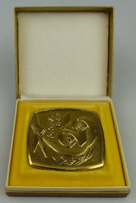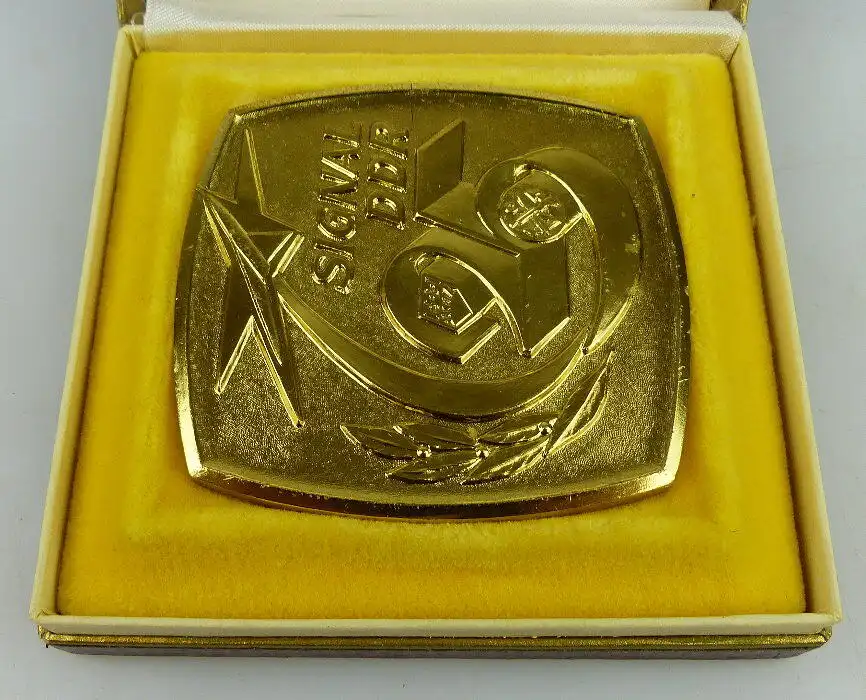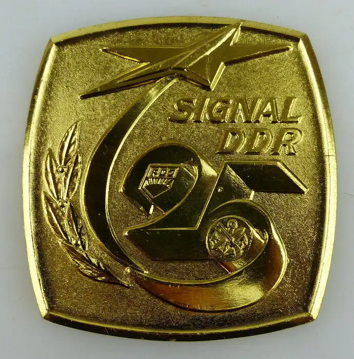 Herzlich Willkommen Gern können Sie auch in meine anderen Auktionen reinschauen. Viel Spaß dabei Sie sehen hier auf eine original alte Medaille im Etui: Signal DDR 25 Farbe: goldfarben \nGröße ca.: 6,5 x 6,2 cm Die Medaille ist im gebrauchten Zustand, mit Gebrauchsspuren. Die Medaille ist nicht gereinigt, geputzt oder geschönt worden. Das Etui ist an den Kanten gebrauchsbedingt bestoßen. Bitte sehen Sie sich die Fotos zum Zustand des Artikels an, da diese Bestandteil der Auktion sind (siehe Fotos oben)