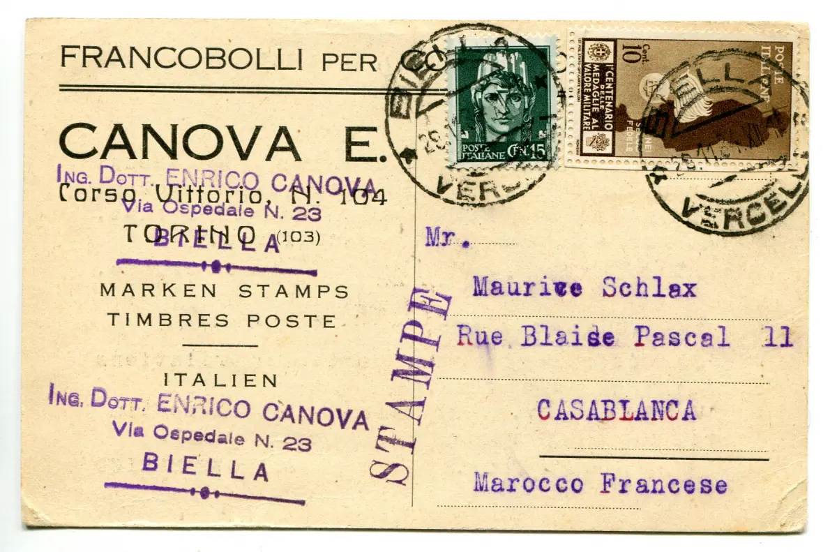 - Medaillen Cent. 10 Nr. 366 + Beilage Nr. 246 auf Handelskarte für Marokko am 29.11.34 - Ungewöhnlich auch für Bestimmungsort Nr. 246 215/A