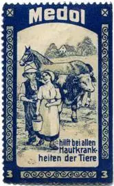 hilft bei allen Hautkrankheiten der Tiere, Nr. 3, Kuh, Pferd, Größe/Zustand: 5x3 , guter Zustand, Original alte Reklamemarke die seinerzeit für die Werbung benutzt wurde