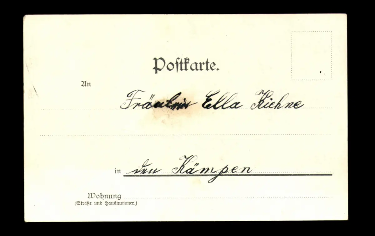 Nicht gelaufen, Ecken bestoßen, leicht fleckig, beschriftet, mittig kleine helle Stelle, Eckbüge.