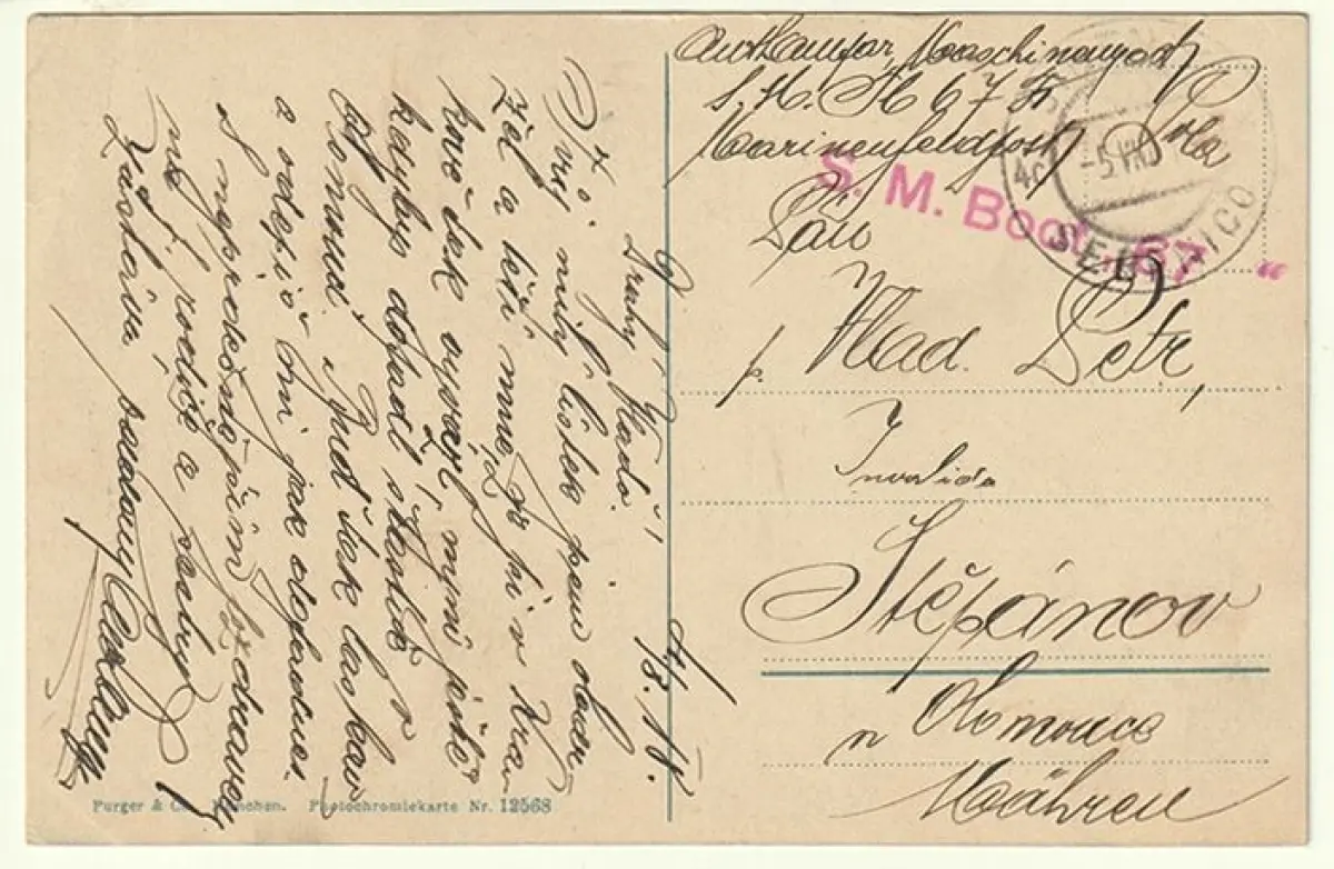 Bemerkungen: Gelaufen m. Stempel: S.M. Boot 67. Einzeiler rot - KALIS4-P.30 neben Tst SIBENIK/5. VIII. 18.